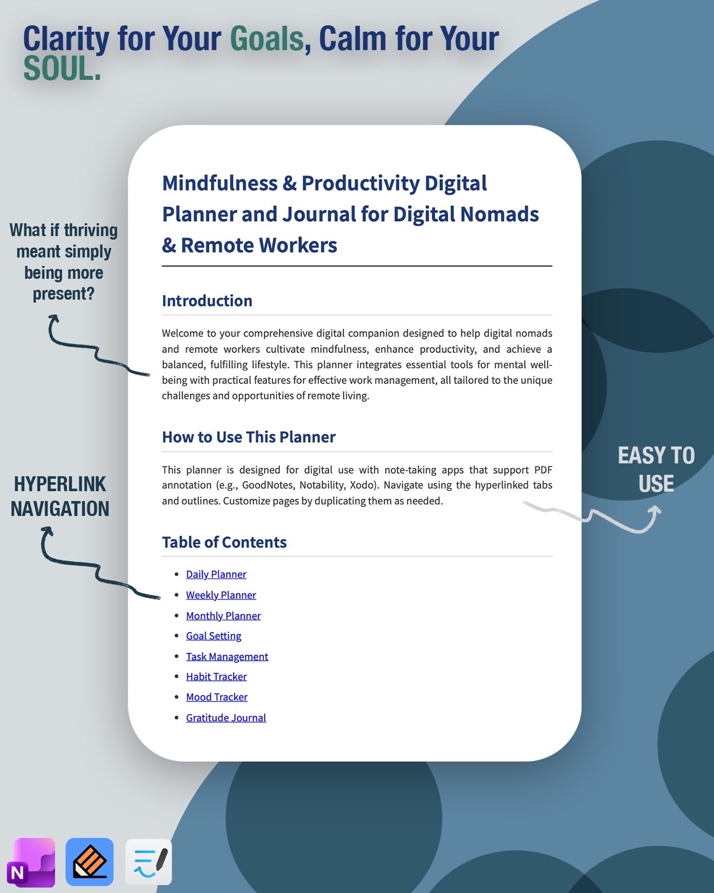 The Clarity Vault is a hyperlinked PDF planner designed specifically for the unique challenges of remote workers and digital nomads. Unlike generic planners, it seamlessly integrates robust productivity tools (goal setting, task management) with essential mindfulness practices (mood tracking, gratitude journaling) to ensure your success is sustainable and balanced. It's a holistic system for work-life harmony.